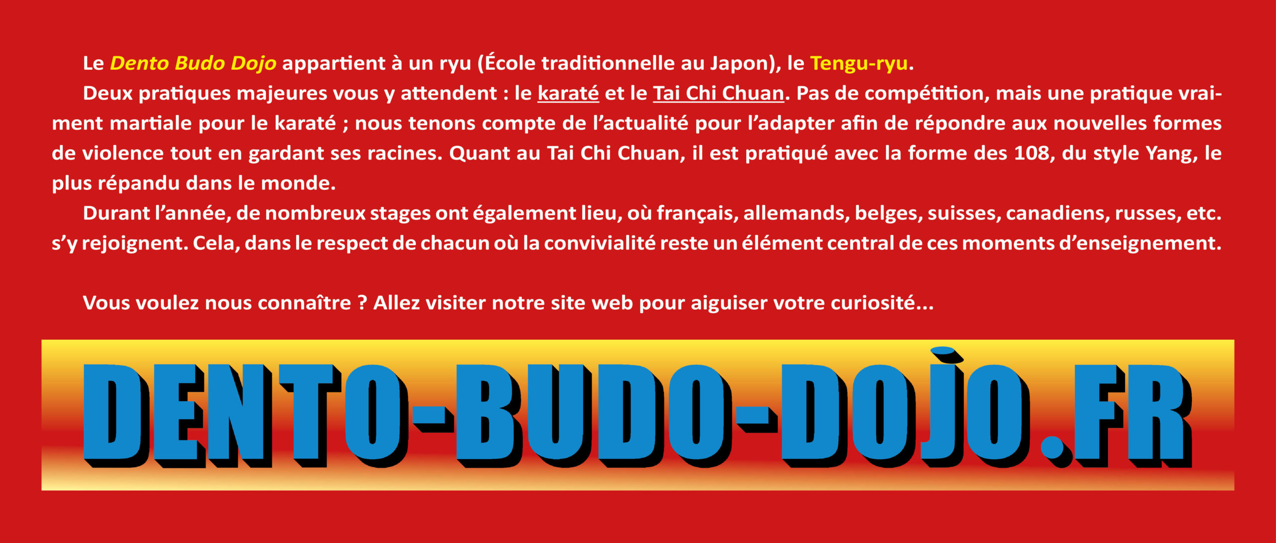 Notre association, le « Dento Budo Dojo », sera présente à la journée des sports du 4 septembre à Sélestat, où nous vous attendons, pour communiquer, pour vous informer de nos pratiques – Tai Chi Chuan et Karaté – et dans quel état d’esprit nous nous situons…
